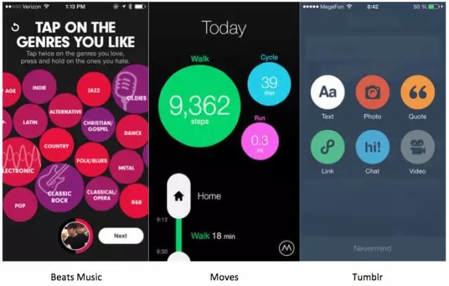 Beats Music把選擇喜歡的標(biāo)簽設(shè)計(jì)成了圓形,這就比普通的列表、矩形tag的感覺(jué)要好很多,更加趣味更具探索性。Movse每天走的步數(shù)、消耗的卡路里均用圓形承載,是數(shù)據(jù)可視化、關(guān)鍵信息顯性化的最好案例。Tumblr則把要?jiǎng)?chuàng)建的內(nèi)容的類(lèi)型選擇,用蒙層+圓形選項(xiàng)按鈕來(lái)設(shè)計(jì),讓選擇變得專(zhuān)注而明確,又不那么死板。