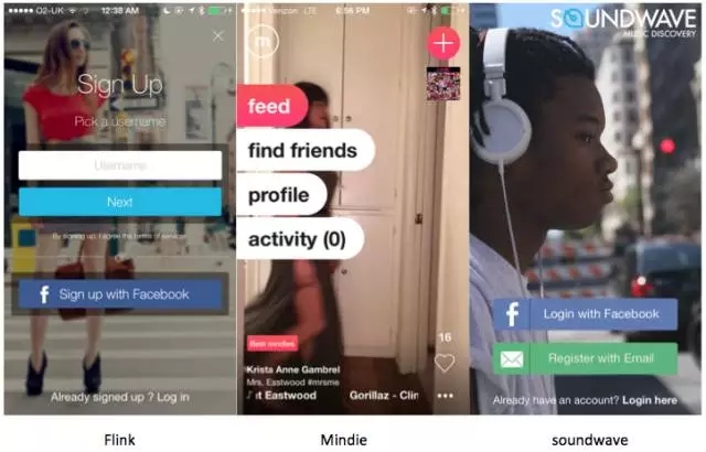 大視野背景圖風(fēng)格也分為兩種,一種像Secret、The Whole Pantry這樣的,內(nèi)容區(qū)塊中采用大視野背景圖,好處是可以利用圖片做區(qū)塊分割,難度是圖片拼接后的效果不一定好看,所以可能還需要配合描邊、留白等設(shè)計(jì)手段優(yōu)化拼接。另外一種就是想Vsco、Flink、Mindie、Soundwave這樣的,全屏背景圖甚至打通狀態(tài)欄,前景做內(nèi)容排版、導(dǎo)航、操作。好處是設(shè)計(jì)非常具有生命了,所有有朋友把這種風(fēng)格也叫有計(jì)劃設(shè)計(jì),說(shuō)的就是回歸大自然的設(shè)計(jì)手法。但風(fēng)險(xiǎn)也是很明顯的,就是前景的信息排布設(shè)計(jì)其實(shí)是有很大挑戰(zhàn)的,必經(jīng)花花綠綠的背景太過(guò)于干擾注意力,導(dǎo)致前景的文字內(nèi)容可讀性會(huì)變?nèi)?。所以需要把重要操作用明確的按鈕區(qū)隔出來(lái),閱讀型文字跟背景圖要用明顯的反色,還是不行的話就把文字浮在半透明蒙層上,解決可讀性問(wèn)題。