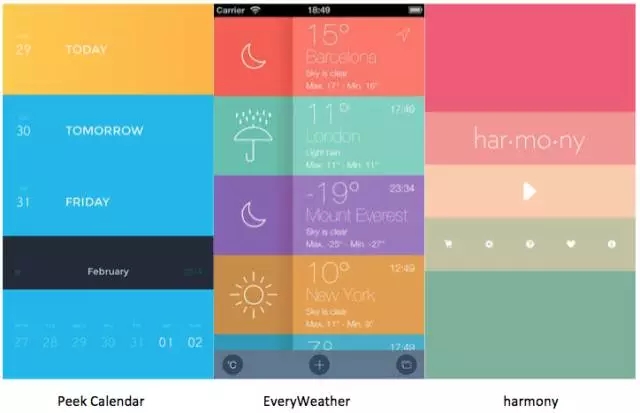 而Peek Calendar、EveryWeather和Harmony這三個(gè)APP,是列表多彩色的設(shè)計(jì)案例,這種列表多彩色,不知道是不是從Clear開(kāi)始再度流行起立的,用鮮亮的多彩色來(lái)區(qū)分信息,確實(shí)能起到突出的效果,視覺(jué)上極其醒目。