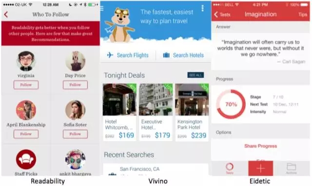 Readability采用紅色主色調(diào)設(shè)計(jì),連提示信息背景色、線性按鈕和圖標(biāo)都采用紅色主色調(diào),界面和LOGO也完全是一個(gè)色系的。而Vivino采用藍(lán)色主色調(diào)設(shè)計(jì),信息用深藍(lán)、淺藍(lán)加以區(qū)隔。Eidetic采用橙色主色調(diào)設(shè)計(jì),其中的關(guān)鍵操作按鈕甚至整個(gè)用橙色提亮,信息圖標(biāo)也用深橙色、淺橙色來(lái)表達(dá)程度。 可以說(shuō)唯一主色調(diào)設(shè)計(jì)手法,是真的做到了移動(dòng)端APP的最小化(Minimal)設(shè)計(jì),減少冗余信息的干擾,使用戶專(zhuān)注于主要信息的獲取。