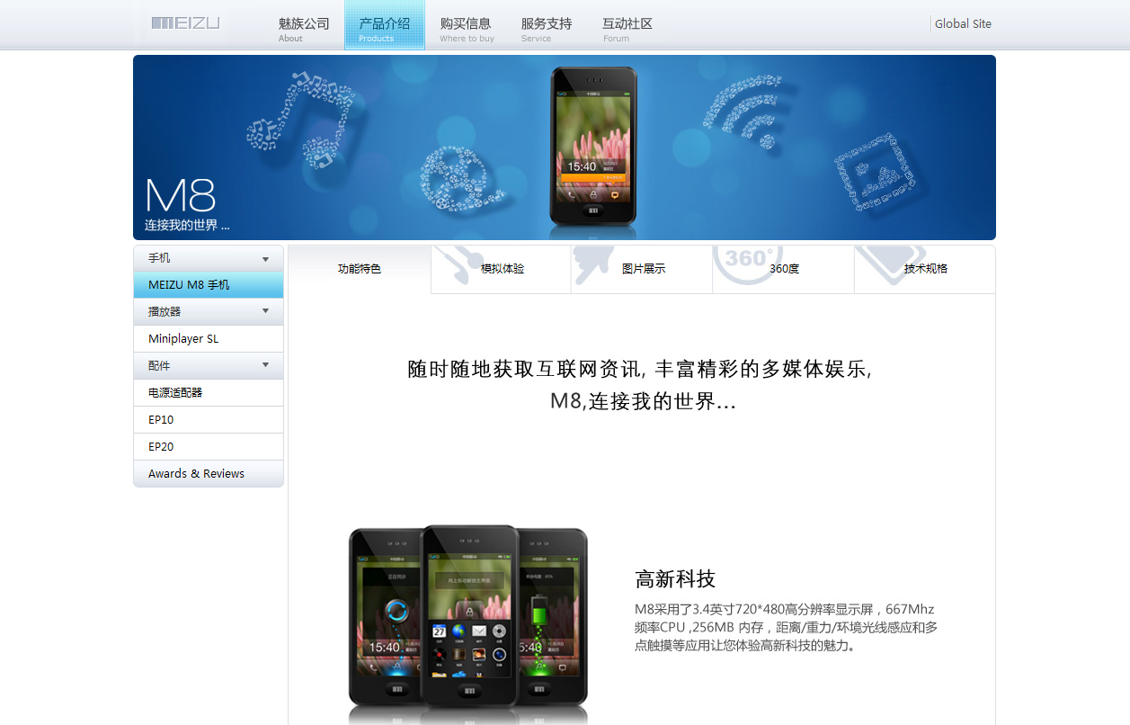 4 魅族公司官網(wǎng),也是藍(lán)藍(lán)個人非常喜歡的風(fēng)格,格局大方,恢宏穩(wěn)重,沒有多余的東西,極簡單而條理清晰,重點的圖設(shè)計精致、表達(dá)需求明確,而且唯美,大量空白顯的頁面不擁擠,有想象的空間。