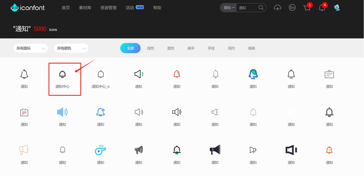 我就拿最常用的阿里巴巴圖標(biāo)庫,打開網(wǎng)址,找通知圖標(biāo),直接下載第一頁,第 1 排第 2 個: