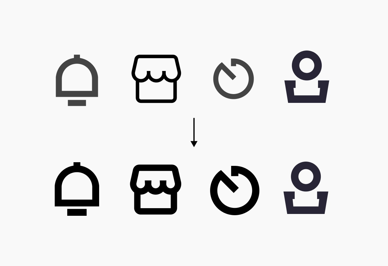 有了素材之后,我們首先要讓他們看起來是一套的,所以在統(tǒng)一性上需要優(yōu)化,先優(yōu)化大小和線條粗細: