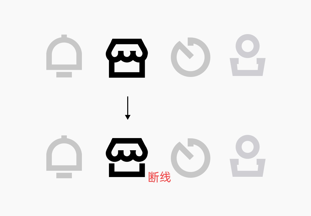 直角圓角統(tǒng)一了之后,還有一個統(tǒng)一性就是斷線,只有第二個沒有斷開的設(shè)計,所以我們再把商城進行斷線處理: