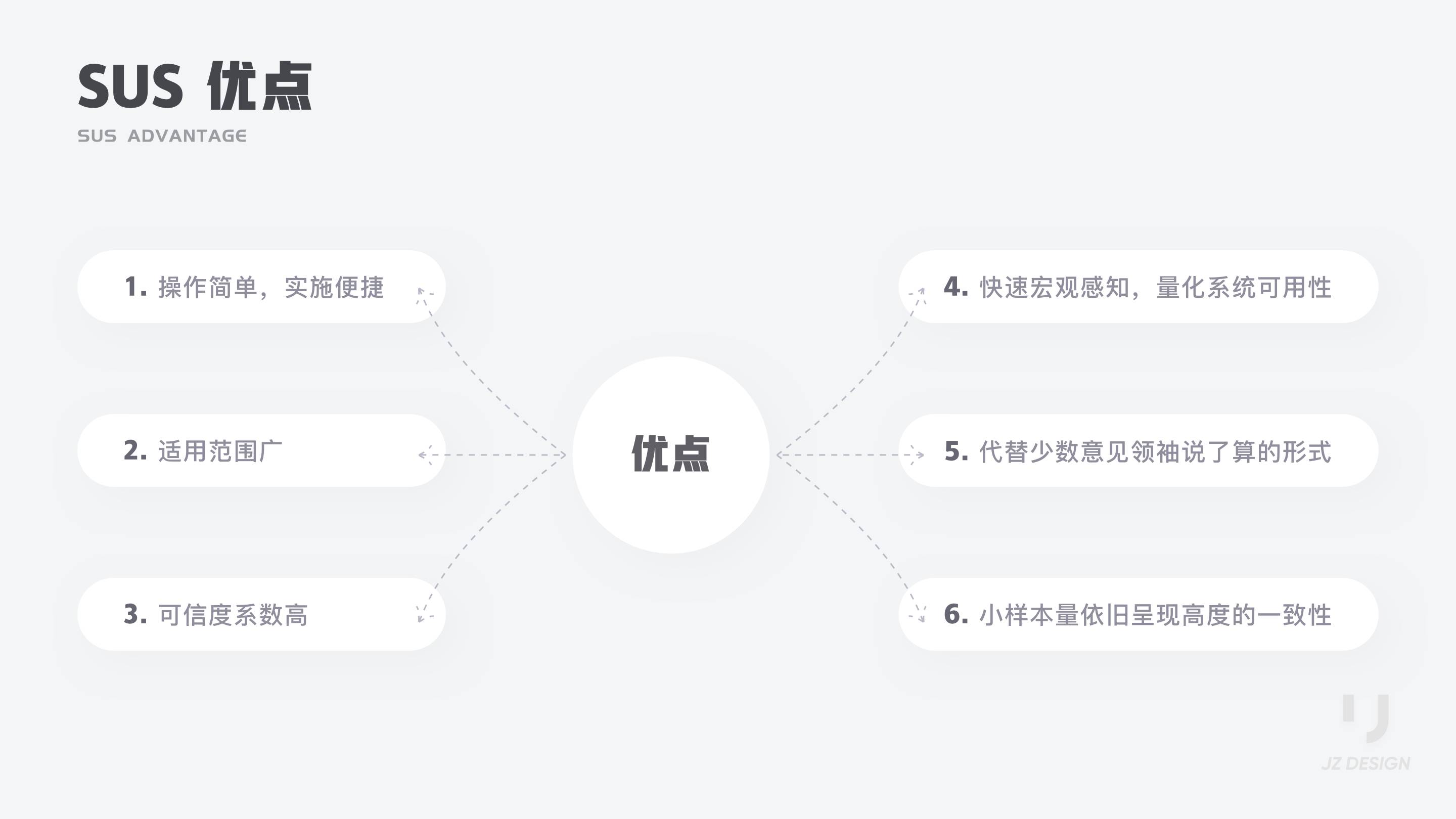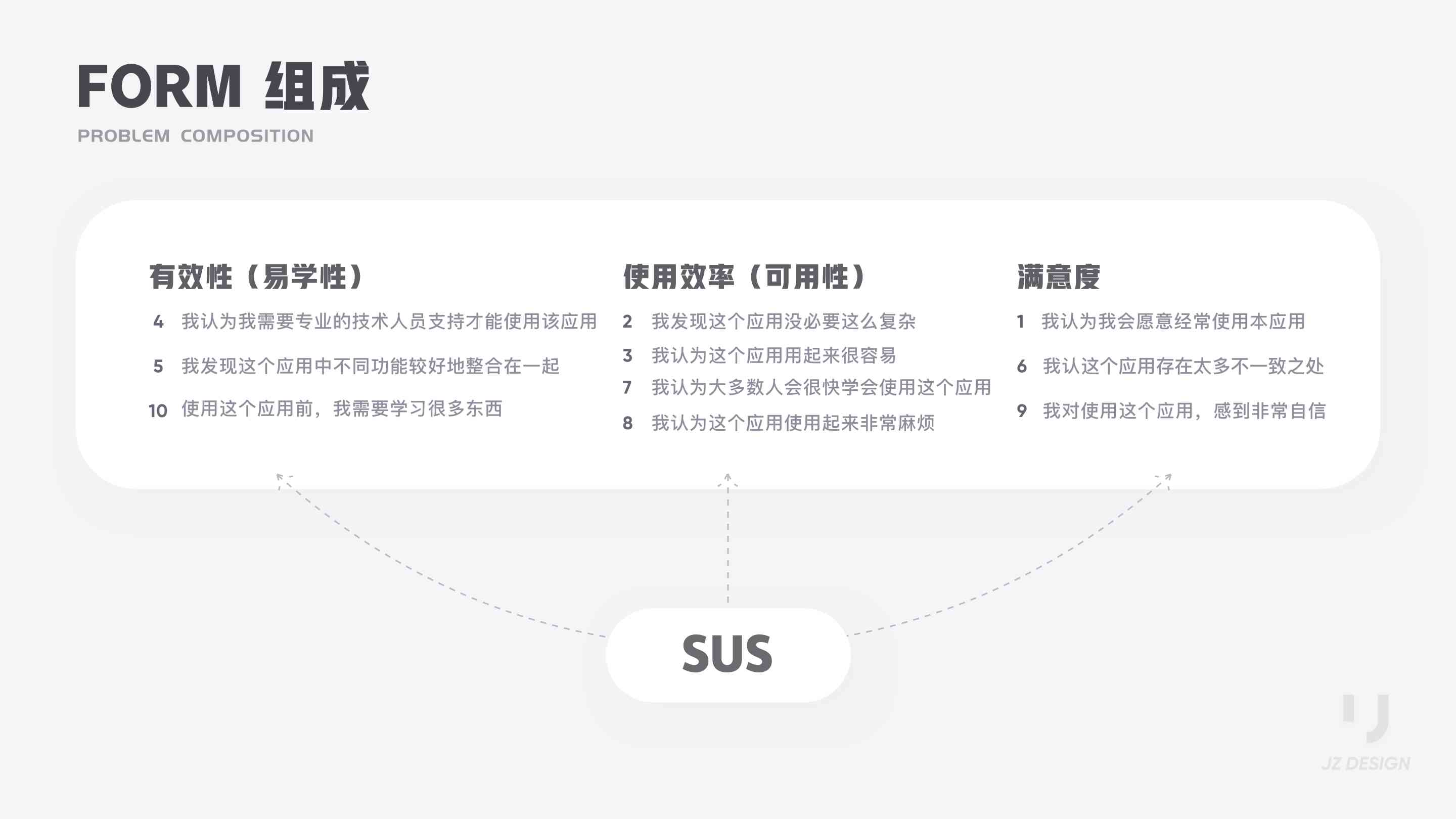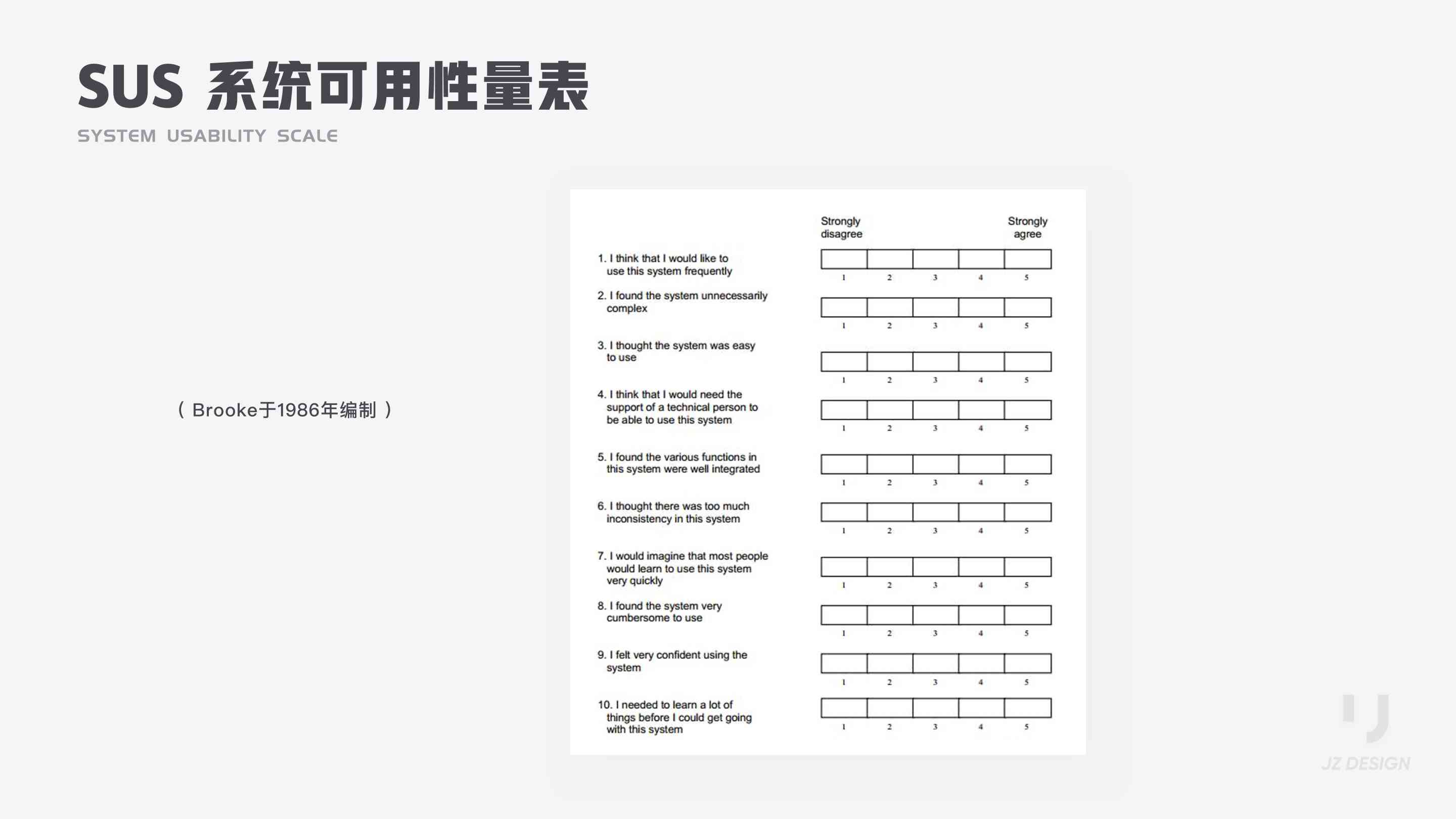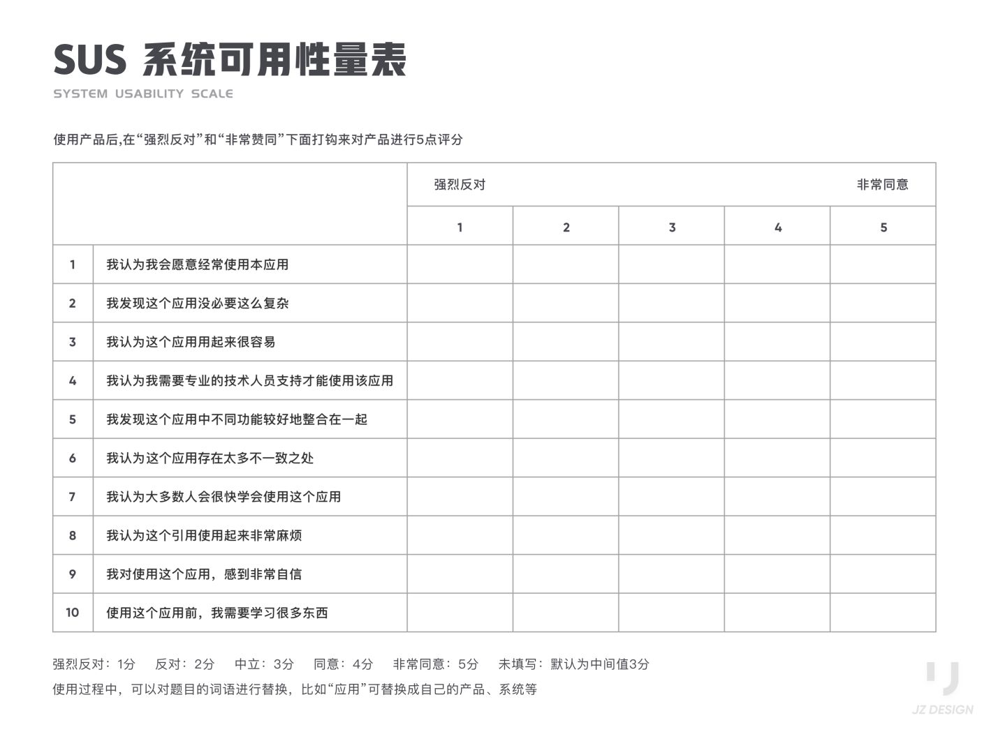 SUS 全稱 System Usability Scale ,系統(tǒng)可用性量表。SUS最初是Brooke于1986年編制,可以科學地量化用戶體驗,用于完成一系列任務場景后,對產(chǎn)品或系統(tǒng)整體宏觀的感知可用性測量。