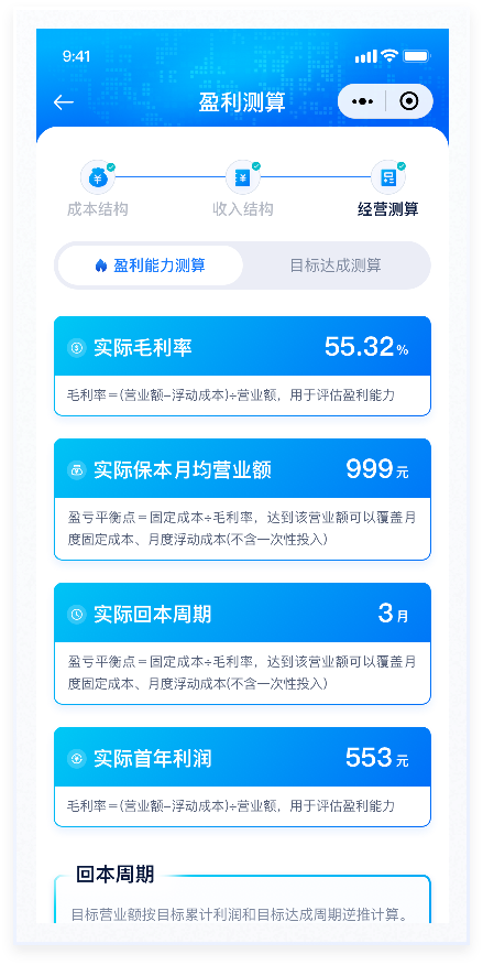 所盈利測(cè)算功能是產(chǎn)品的主要功能,通過AI對(duì)未來開店盈虧情況進(jìn)行預(yù)測(cè)評(píng)估。本次設(shè)計(jì)主要優(yōu)化該流程的交互及視覺表現(xiàn),整個(gè)流程分為“成本結(jié)構(gòu)”“收入結(jié)構(gòu)”“經(jīng)營測(cè)算”三個(gè)階段,過程填寫情況放置在頁面頂部,一步了然。已填寫使用主題色標(biāo)注,未填寫則使用置灰顏色處理,符合用戶基本感知。按鈕使用與主色相近的漸變色。