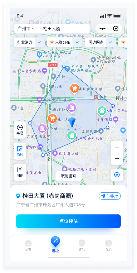 按鈕換膚在地圖上,“半徑”“選區(qū)”便于用戶對(duì)開店范圍的選擇,“圖例”則更側(cè)重圖標(biāo)說明性?!胺糯蟆薄翱s小”“定位”則是對(duì)顯示內(nèi)容的操作。